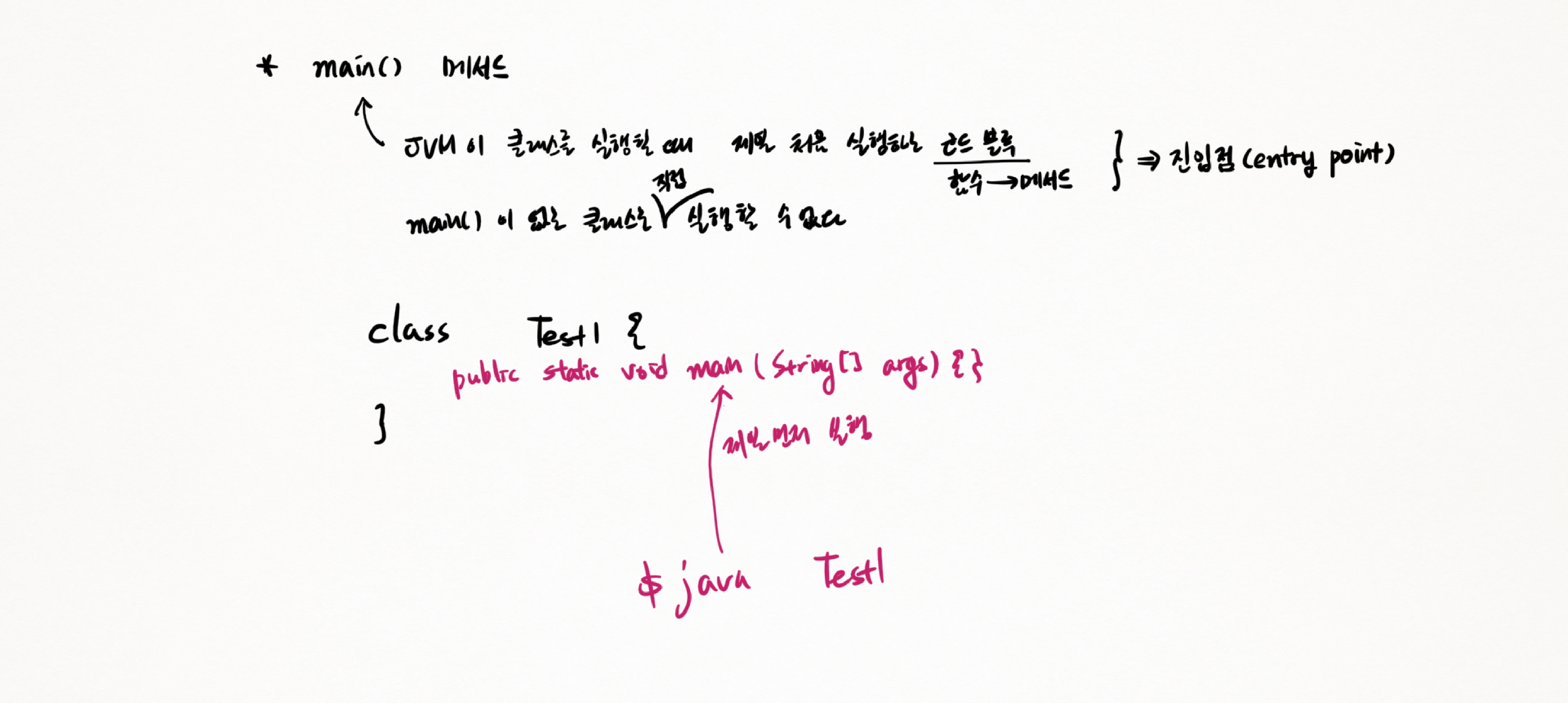 JVM이 클래스를 실행할 때 제일 처음 실행하는 코드 블록 (함수→메서드) → 진입점(centry point)
