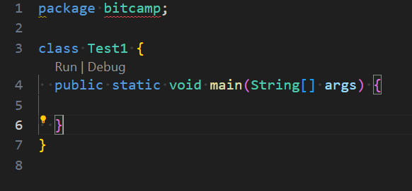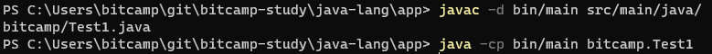 java는 위에서 생성된 bin/main 폴더 안에 bitcamp 패키지 안에 있는 Test1.class 를 컴파일하는 것이다.