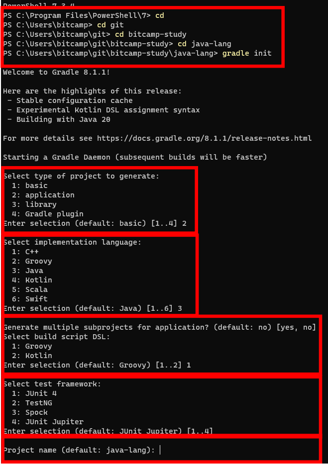 Gradle을 사용하려면 프로젝트 폴더에서 gradle init 명령을 실행하여 초기화하고,