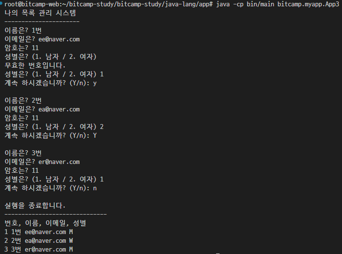 - 배열 num, name, email, password, gender를 static으로 선언하여 main() 메소드에서 사용할 수 있도록 변경 배열은 클래스 멤버로 이동하고, main() 메소드 상단에 선언 및 초기화