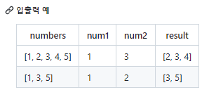 정수 배열 numbers와 정수 num1, num2가 매개변수로 주어질 때, numbers의 num1번 째 인덱스부터 num2번째 인덱스까지 자른 정수 배열을 return 하도록 solution 함수를 완성해보세요.
