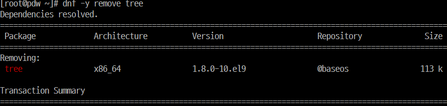 | dnf -y remove tree | tree 패키지 삭제 (-y 옵션은 모든 질문에 대해 yes로 답하는 옵션) |