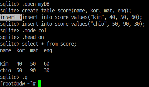 | insert into score values("kim", 40, 50, 60); | score 테이블에 데이터 추가 |