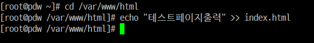 - 홈페이지 문구 바꾸기: cd /var/www/html -> echo "테스트페이지출력" >> index.html