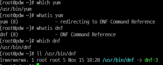 | ll /usr/bin/dnf | dnf와 yum은 dnf-3의 심볼릭 링크이며, 해당 경로에서 확인 가능함 |