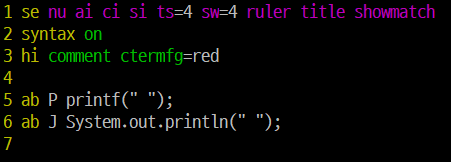 | 1행 | 줄번호(nu), 자동인덴트(ai), 컬러(ci), 스크롤바(si), 탭간격(ts=4), 스페이스바(ts=4), 상태바(ruler), 제목(title), 일치하는 괄호 표시(showmatch) 설정 |