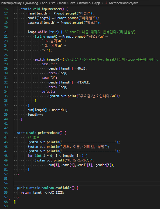 inputMember 메소드는 사용자로부터 이름, 이메일, 암호를 입력받고, 성별을 선택하여 배열에 저장한다.