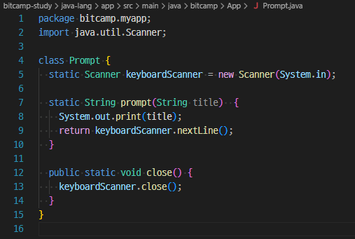 입력과 출력이 더 이상 필요하지 않을 때 Prompt.close()를 호출하여 Scanner 객체를 닫는다.