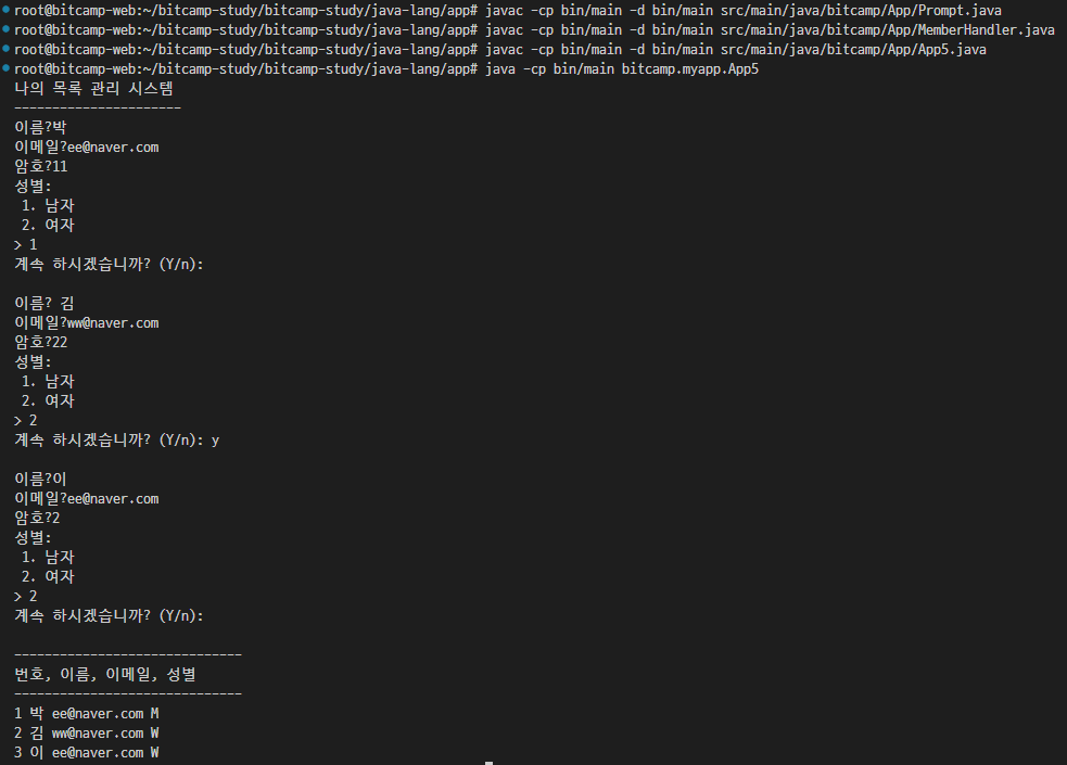 MemberHandler 클래스의 메소드를 사용하여 회원 정보를 입력받고 출력한다.