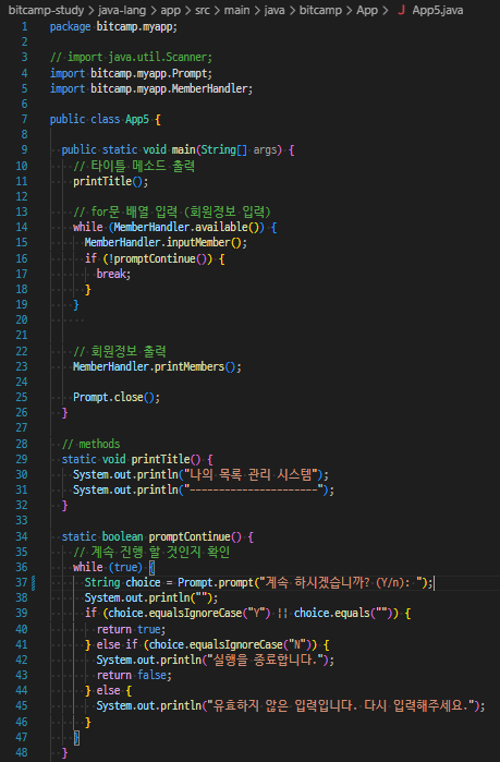 promptContinue 메소드는 사용자로부터 계속 진행할 것인지를 입력받는다.