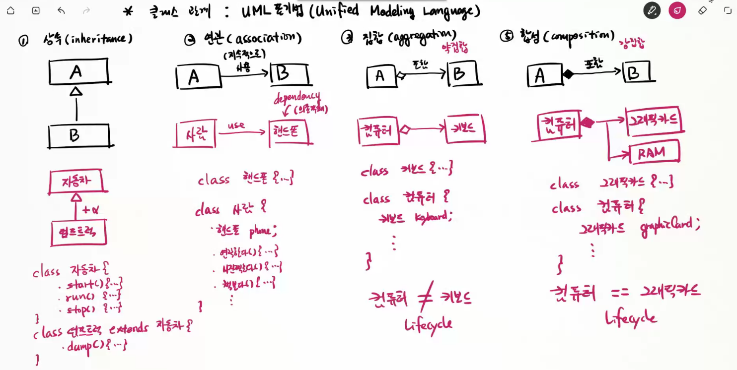 클래스가 다른 클래스를 포함하면서 더 강한 종속성을 가지는 관계입니다.