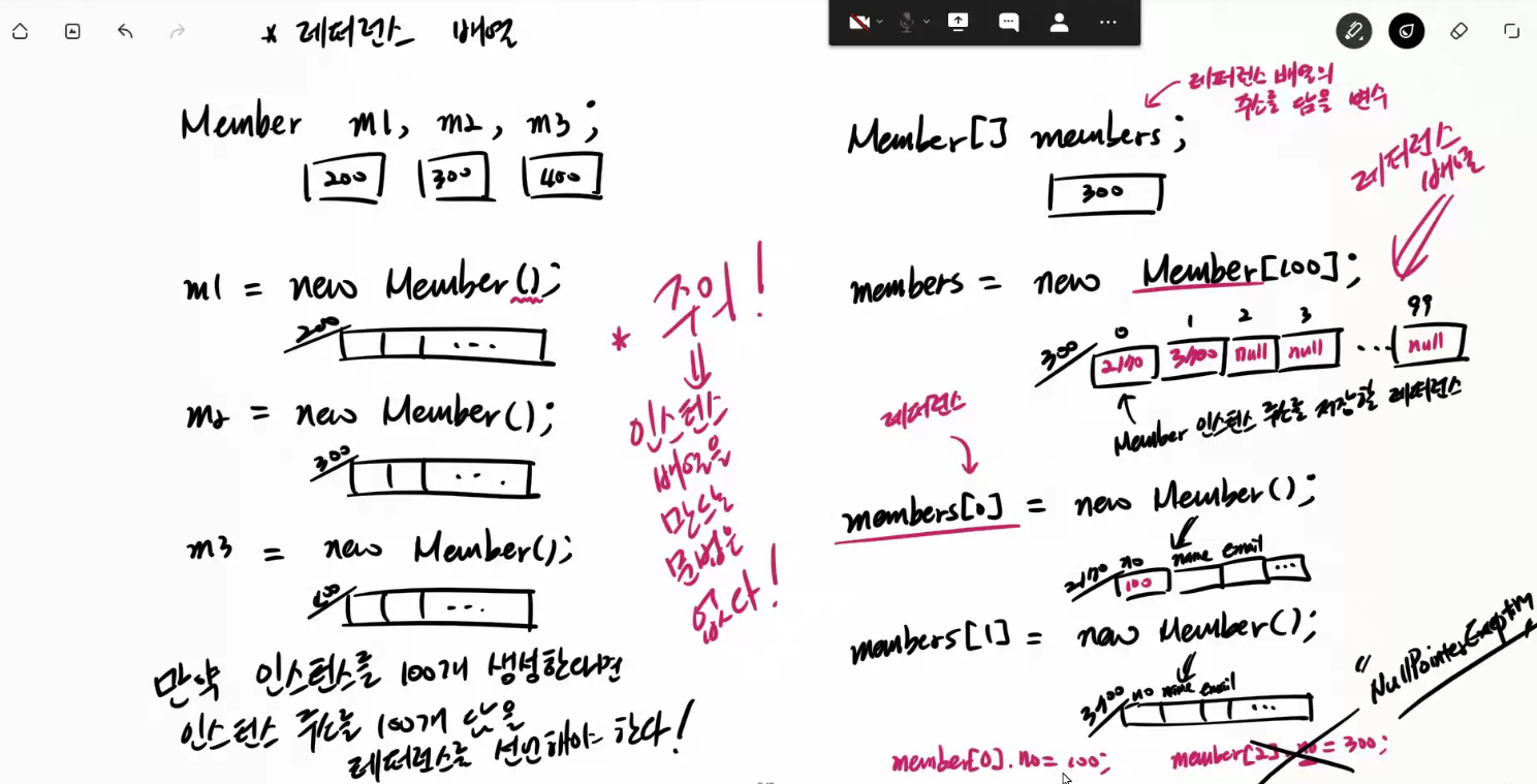 * 만약 인스턴스를 100개 생성한다면 인스턴스 주소를 100개 담을 레퍼런스를 100개 선언해야 한다 !