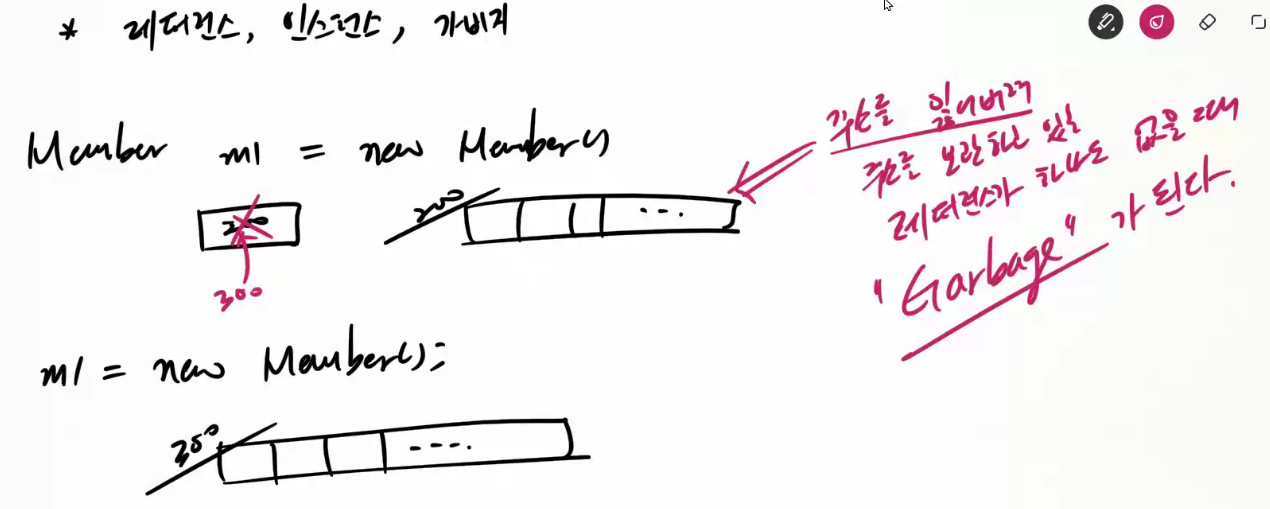 객체를 가리키기 위해 레퍼런스 변수에 해당 객체의 메모리 주소가 할당됩니다. 이렇게 객체를 참조하는 레퍼런스 변수가 존재하면, 해당 객체는 메모리에서 해제되지 않습니다.