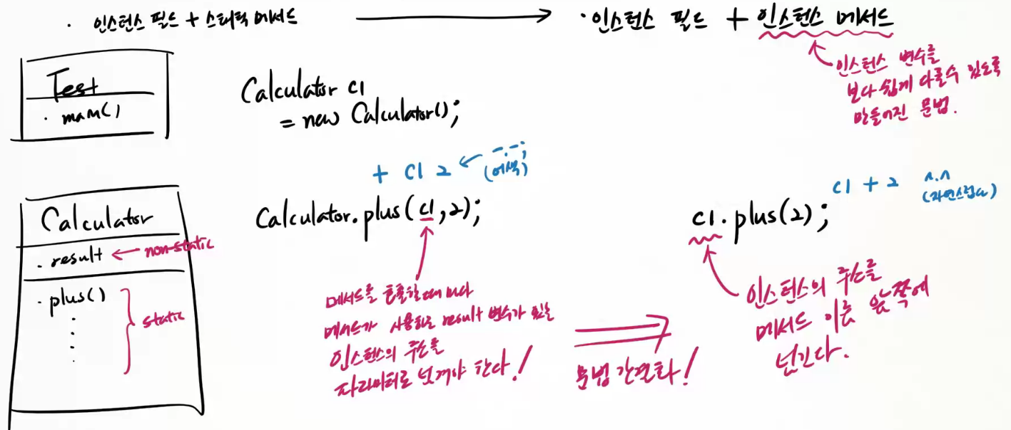 여러개의 필드를 갖게 하기 위함이다. 때문에 필드가 여러개이면 static 변수를 사용하지 않고 instance 메소드를 사용해야한다. 이것은 자동으로 this 라는 명령을 통해서 외부에서 넘겨온 주소를 받아서 결과를 출력해줄 수 있다.