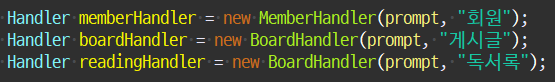 - Prompt, MemberHandler, BoardHandler및 의 인스턴스를 설정합니다 ReadingHandler.