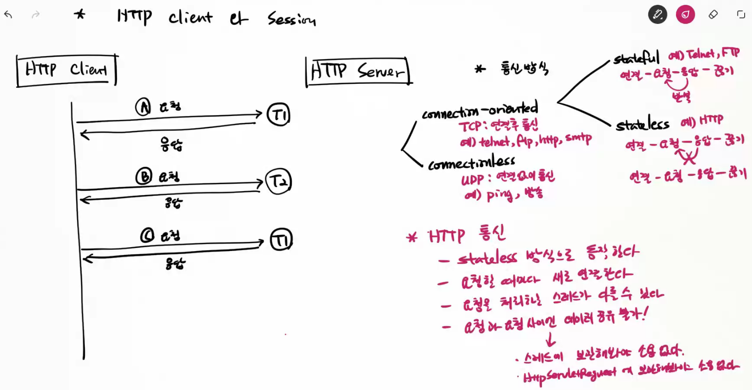 ㄴStateless : HTTP (요청할 때마다 새로 연결, 요청과 요청 사이에 데이터 공유불가.)
