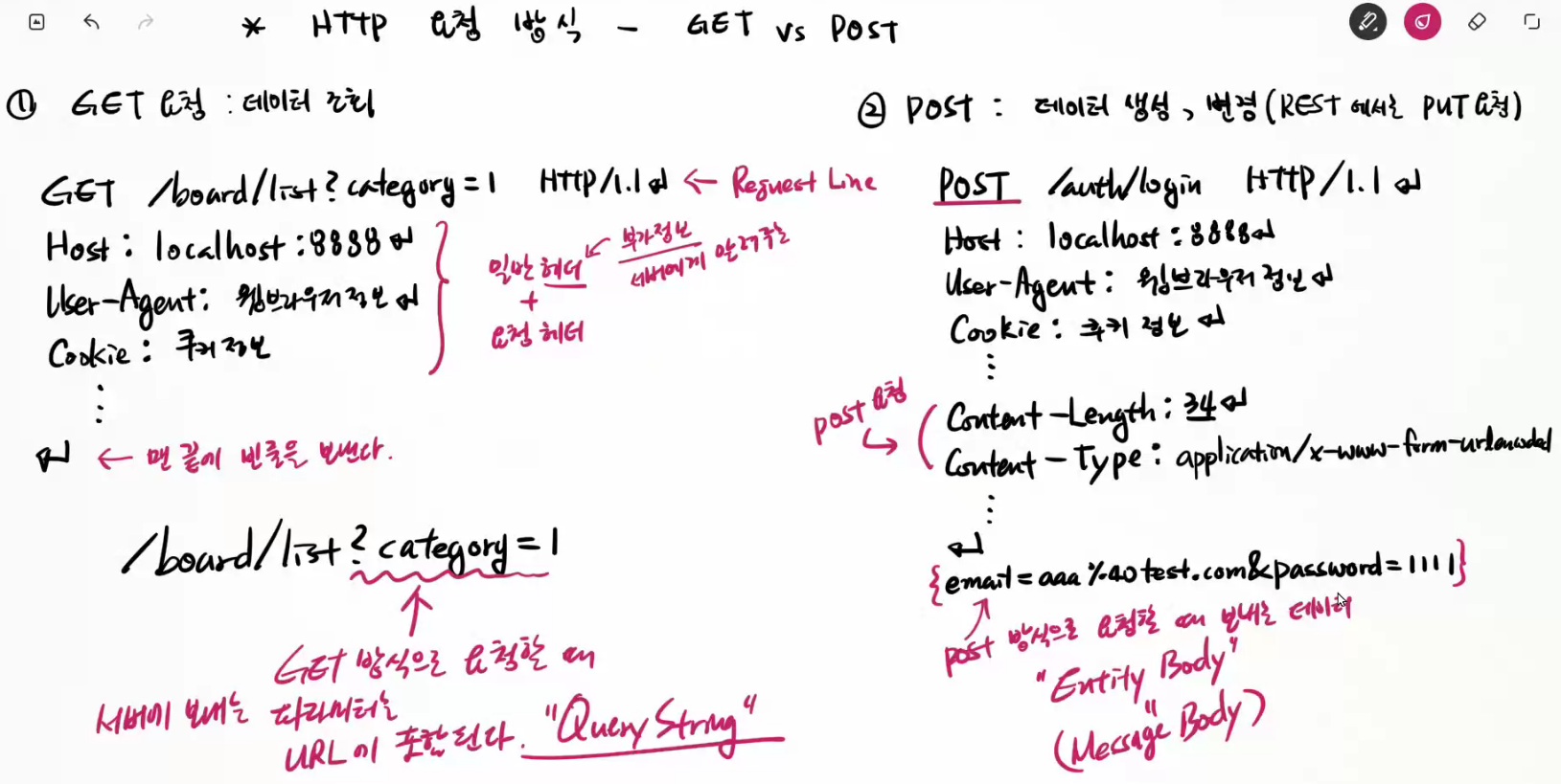 로그인 같은 경우처럼 이메일&패스워드를 보내면 안되는 경우에는 Post 방식을 취해야한다.