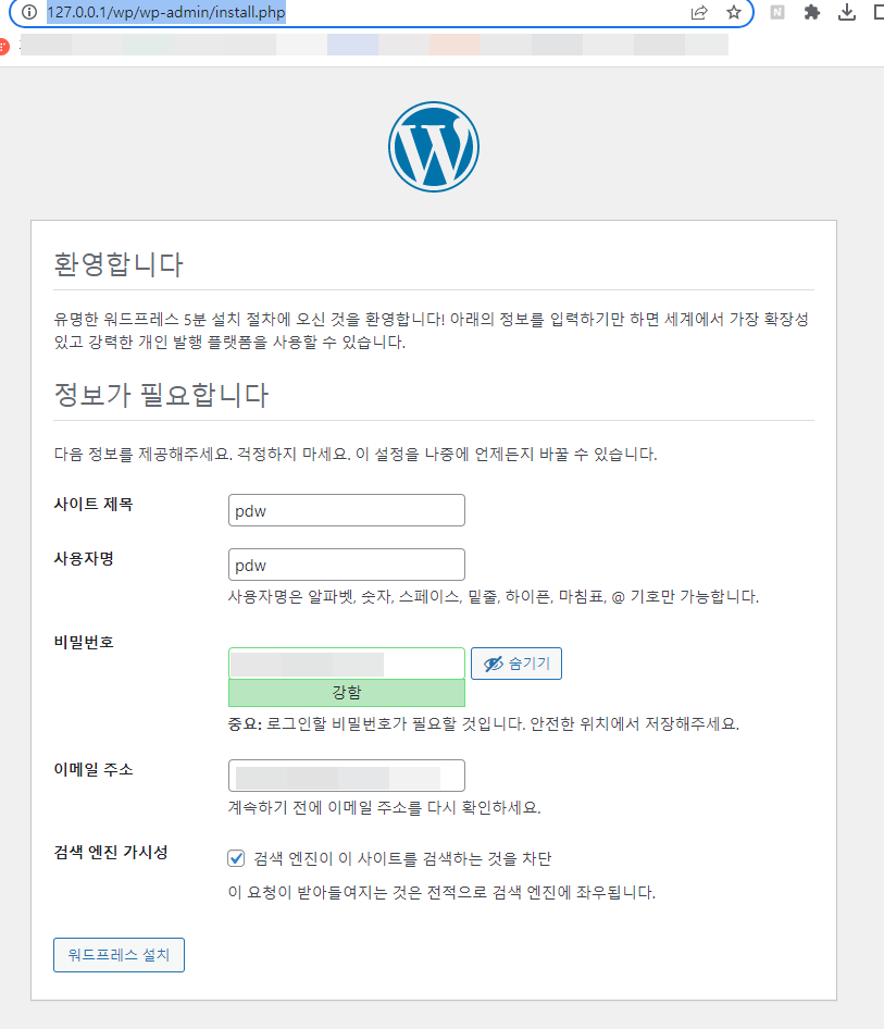 http://127.0.0.1/wp/wp-admin/install.php 실행결과
