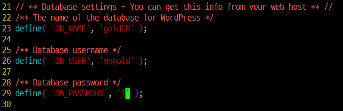 ● vi 편집기로 wp-config.php 파일을 만들어둔 mysql 아이디로 내용을 수정