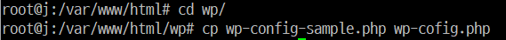 cd wp/ 명령어로 wp 폴더에 진입한 뒤 wp-config-sample.php 파일을 따로 복사해줍니다.