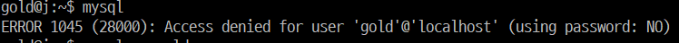mysql만 입력할 경우 오류가 발생하는 경우가 있는데, 이럴 때는 mysql -u gold -p 명령어를 통해 권한을 갖고 실행하도록 하자. 이제 준비는 끝났으니 다시 root 계정을 실행하도록 하자.