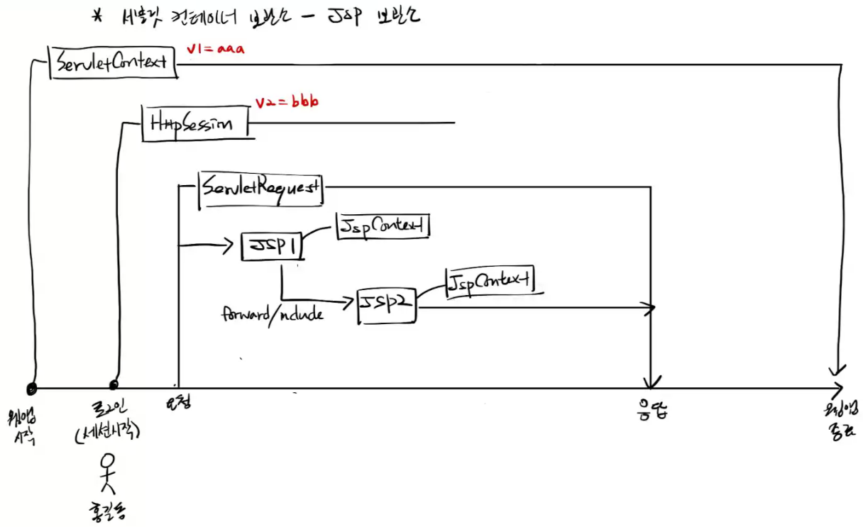 공유되고, 다른 Servlet 요청에 대해서는 공유되지 않지만 포워드/인클루드를 통한 Servlet은