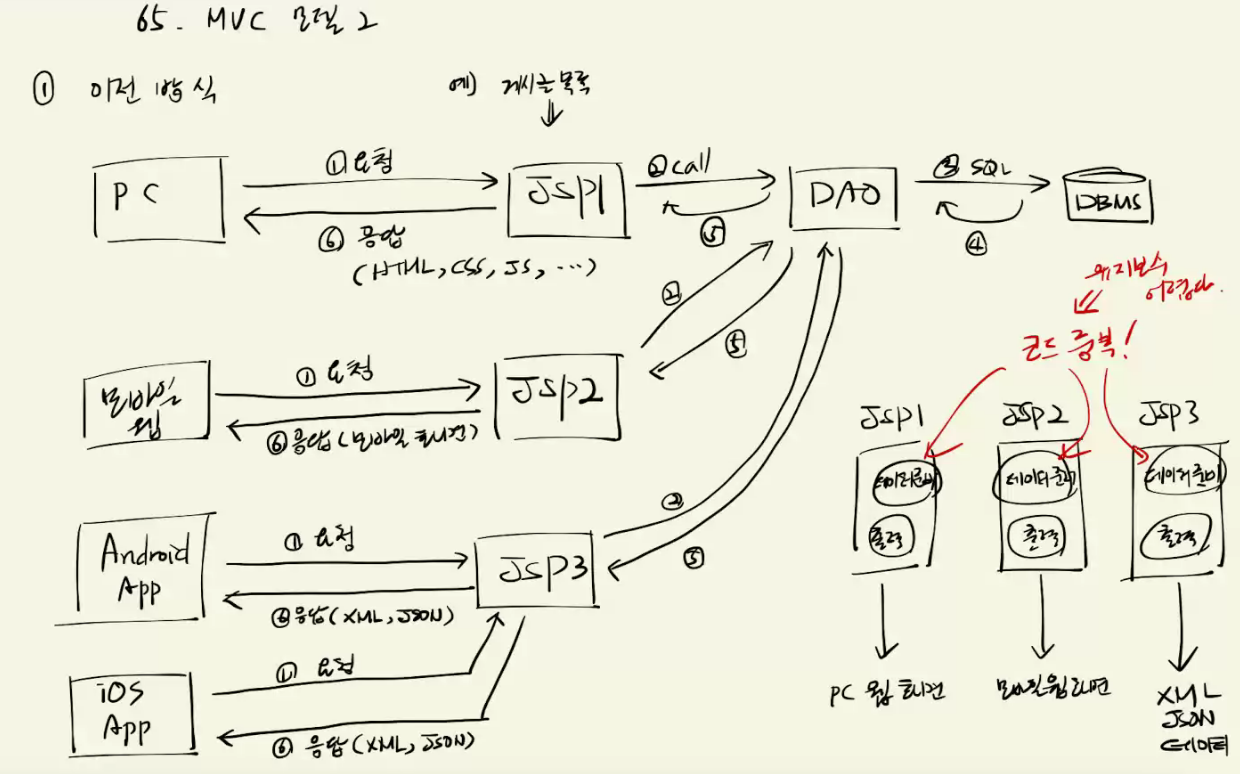 | 단점 | JSP파일이 너무 비대해지며 Controller와 view 가 혼재하므로 향후 유지보수에 어려움 | 설계가 어려우며 개발 난이도가 높음 |