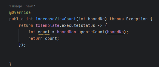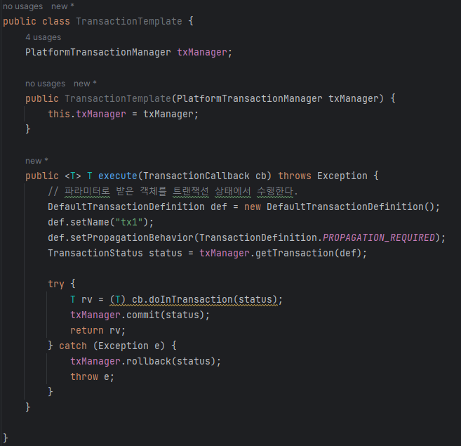 우리가 직접 구현하여 만든 TransactionTemplate 은