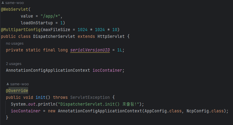 Spring IOC를 도입하여 DispacherServlet 에서 IOC container를 사용하며,