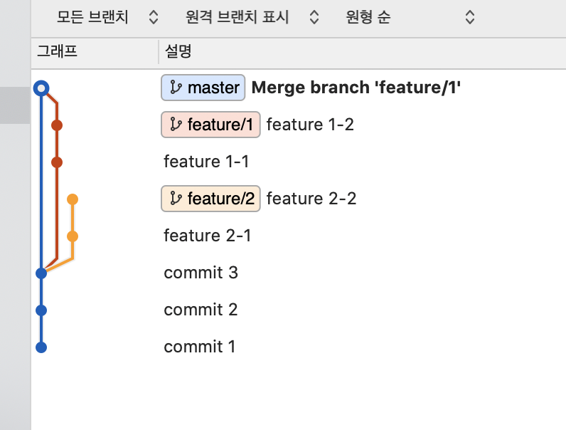 1) 기능 브랜치 합치기 전 (master, feature-1, feature-2)