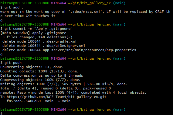 아래의 git 명령들을 실행해주면 .gitignore의 파일들이 적용되어 원격 저장소에서 사라진다.