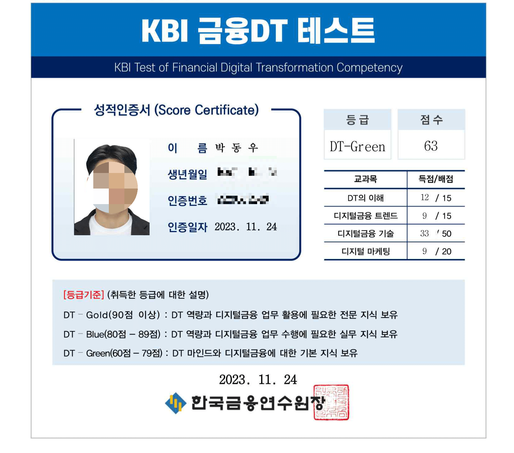 목차 반응형 금융DT GREEN 등급으로 합격했습니다 ,,, 공부기간은 2주인데 농협 PT를 하면서 공부하느라 공부 시간이 짧아서 Blue는 취득하지 못해 아쉽습니다 ... 그래도 작은 성과에 만족합니다ㅎㅎ 내년에 공부 제대로 해서 다시 봐야겠네요 !! +팁을 드리자면 와우패스에 160제 문제만 잘 풀고 책만 잘 읽으면 Green은 합격 가능합니다 ! 반응형 공유하기 게시글 관리 박동우의 기록일기 목차 목차 닫기