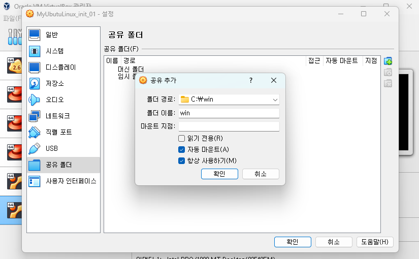 virtual box 에서 공유폴더에 들어가 공유하려는 폴더 경로를 설정하고 자동마운트와 항상 사용하기를 체크해줍니다.