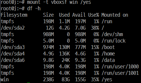 mount -t vboxsf win /yes: VirtualBox 공유 폴더를 /yes 디렉토리에 마운트합니다.