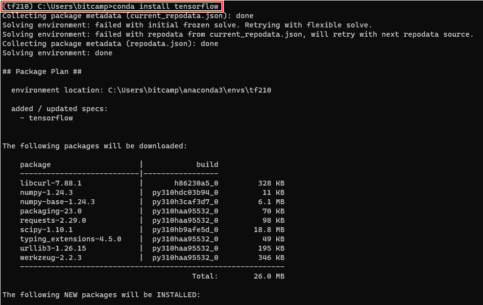 파이썬 가상환경을 생성하는 명령어이다. tf210 으로 생성하였다.