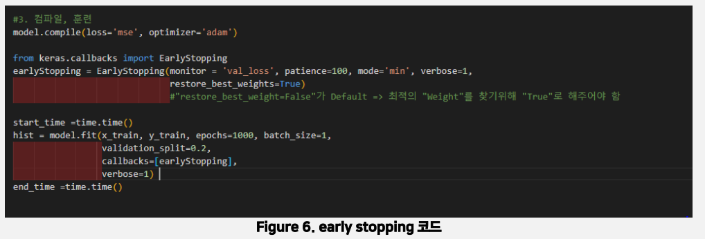 #restore_best_weights:훈련이 끝난 후 모델의 가중치를 가장 좋은 에포크 시점의 가중치로 복원할지 여부를 결정합니다. 이 매개변수가 True로 설정되면, 가장 좋은 에포크에서의 모델 가중치로 복원됩니다. 이는 early stopping으로 인해 마지막에 저장된 가중치가 최적의 가중치가 아닐 수 있기 때문입니다.