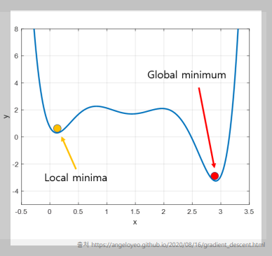 ■ 문제점 1. 극소값(local minimum)에 도달할 수 있다는 것이 증명되었으나 전체 최소값(global minimum)으로 갈 수 있다는 보장은 없음. 극소값에 머물러 있다는 단점. 2. 훈련이 느림