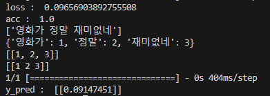Rueters. 데이터를 로드하여 출력하여 acc 를 예측하였다. 강사님께서 0.5보다 높으면 매우 좋은 정확도가 나온 것이라고 해주셨다. 사실 이 acc는 내가 인위적으로 acc를 높게 설정하려고 해서 loss 값과 acc 값이 높게 나온 것이다. 노드 수를 늘리고 Dropout을 많이 주어서 시간을 빠르게 하고 acc 값만을 높이려 하였다.