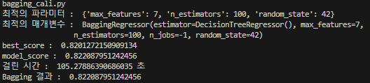# 최적의 매개변수 : BaggingRegressor(estimator=DecisionTreeRegressor(), max_features=7,