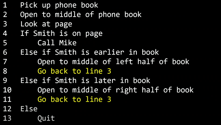 먼저, 전화번호부 가운데를 펼친다. 만약 Mike Smith가 그 페이지에 있다면 우리 알고리즘은 끝난다.