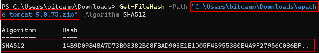 PowerShell 에서 다운로드 폴더에 들어가 설치된 파일링크의 Hash 주소를 확인하는 명령어이다.