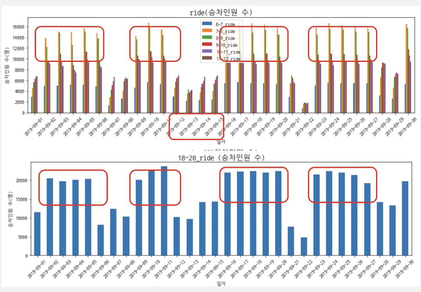 (* 결측치는 존재하지않았고 이상치 제거는 실제 승객 숫자를 나타내는 정보이기 때문에 ,