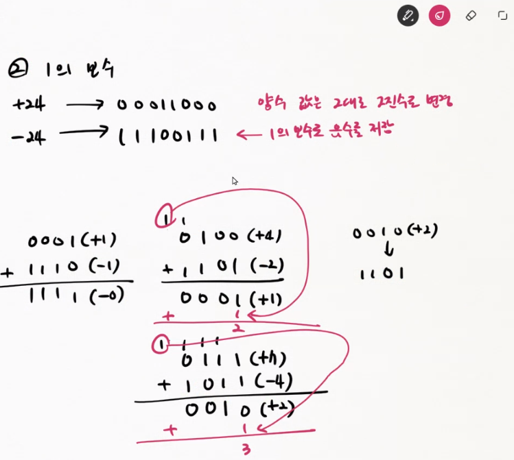 - 두 수를 더한 후 비트 크기를 초과한 1 값을 다시 맨 뒤에 더해야만 옳은 값이 된다.