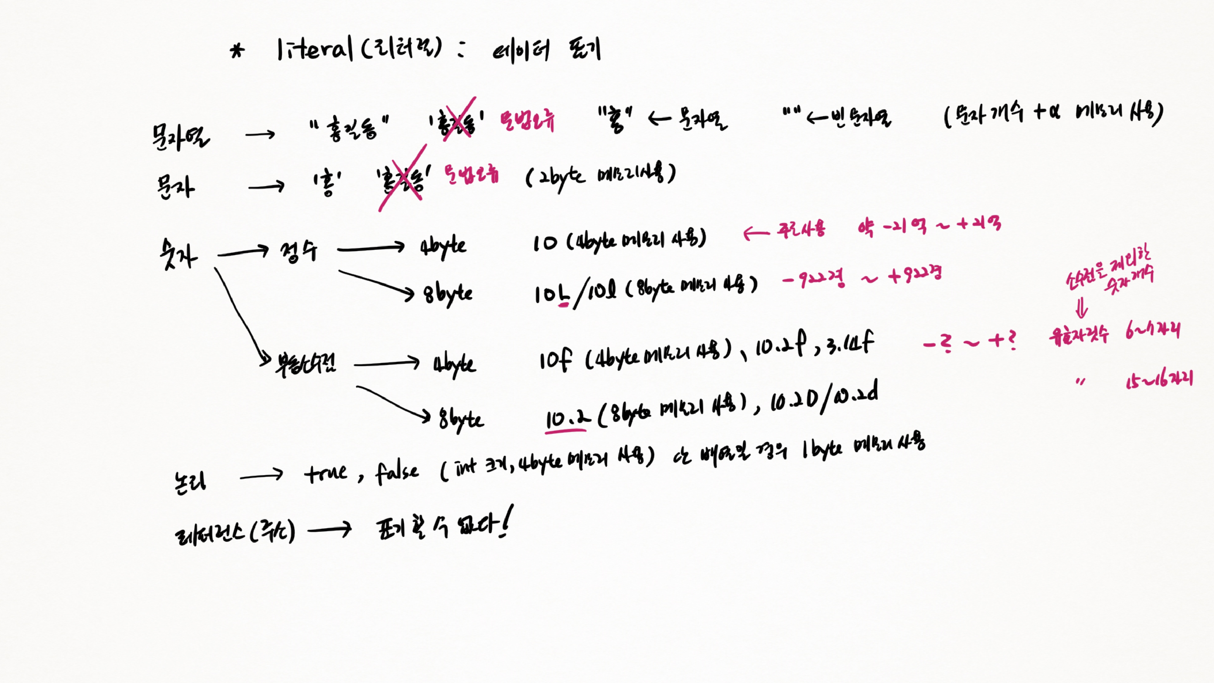 → 부동소수점 → 4byte 10f (4byte 메모리 사용), 10.2f, 3.14f -? ~ +? 유효자릿수 6~7자리 소수점을 제외한 숫자