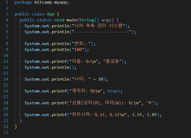System.out.printf("좌우시력: %.1f, %.1f\n", 1.5f, 1.0f);