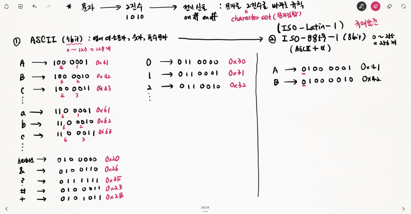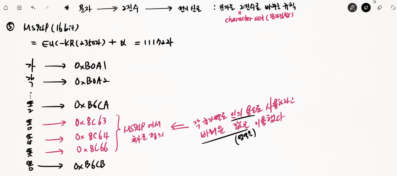 ③ KSC-5601 (16bit) : 한글 문자 따로 정의 → 완성된 문자에대해 2진수 정의 = 초성+중성+종성