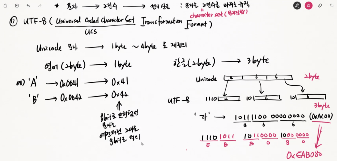 한글 문자 '가'는 UTF-8에서는 3바이트로 표현.