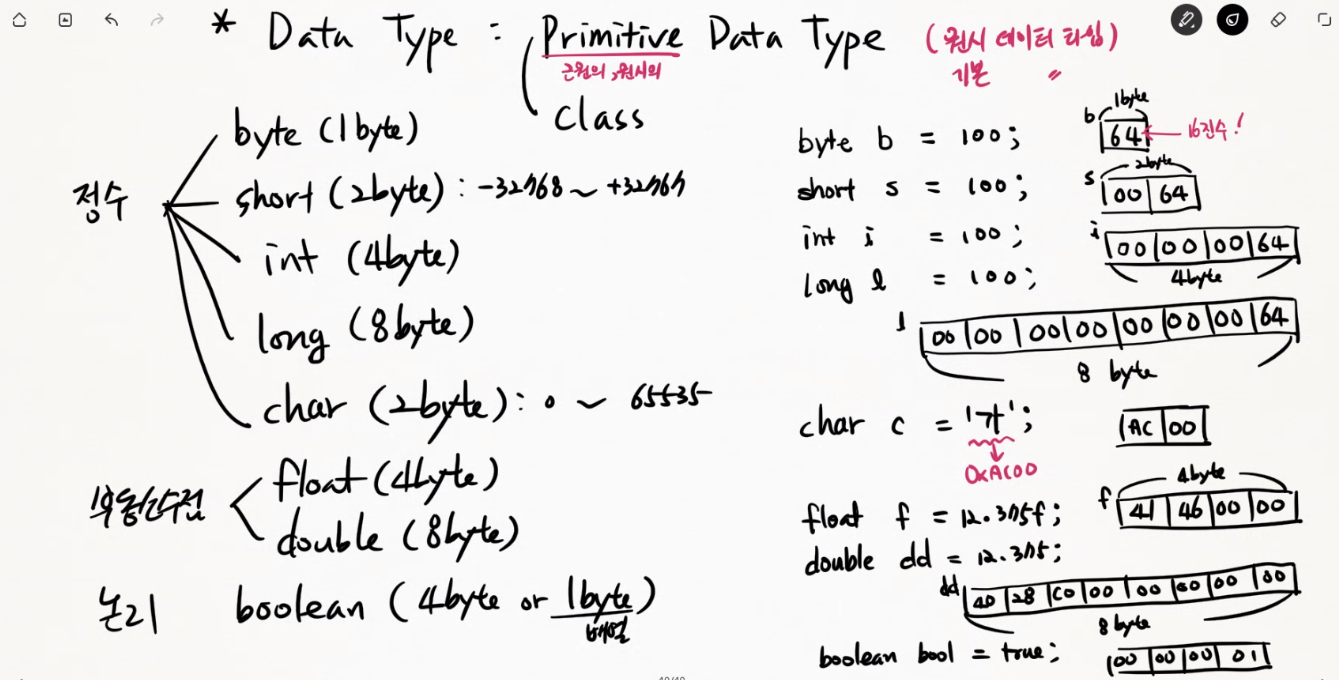 int : 정수 값을 담는 용도의 메몰이며 크기는 4byte 이다.