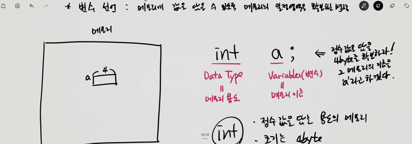 * 변수 선언 : 메모리에 값을 담을 수 있도록 메모리의 일정 영역을 확보하는 명령